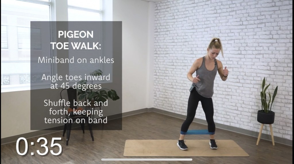 I was impressed by how they modify common exercises to target a cyclist’s weak muscle groups—for example, the pigeon side step. With a band around your ankles, you take three side steps to the left and then three steps to the right. However, you perform this maneuver, pointing your toes inward slightly – pigeon-toed. Simply turning your toes in targets the glute muscles, which are weak for most cyclists.