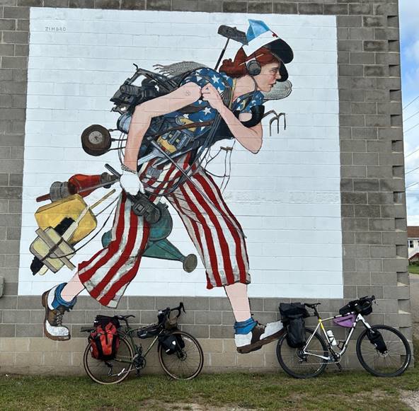 We set out around 11 am. Barb was along for the Full Monty, while George would leave us at mile 18 in Hillsboro. Living in Madison, WI, George was familiar with the trail and enjoyed serving as a tour guide, pointing out key sights along the way, including the latest mural in Wonewoc. It is a rendition of Norman Rockwell’s Rosie to the Rescue. Besides the Rosie mural, the town had three others within a two-block radius.