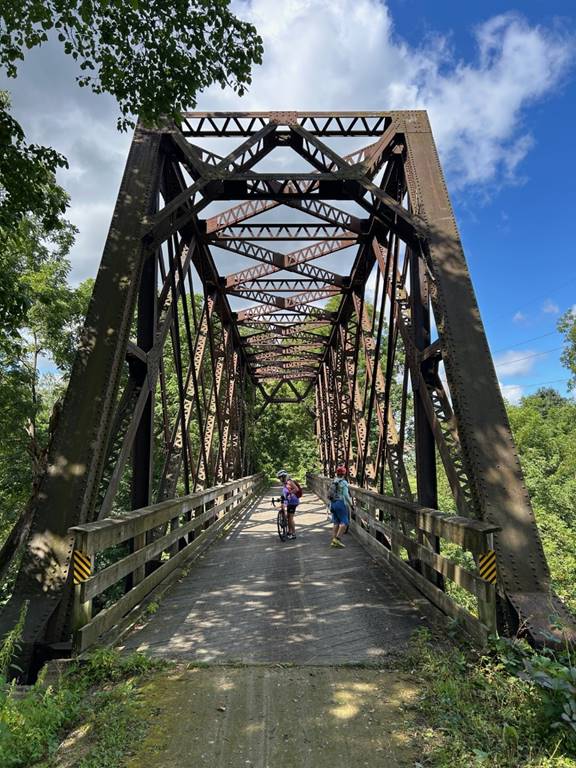 The section of railroad between Elroy and Sparta was completed in 1873 by the Chicago and North Western Railway (C&NW). Trains had to manage a 3% grade, going uphill into the tunnels and downhill into the next community. To overcome the grade, locomotives would use pusher or helper engines to aid the trains uphill. Gravity would then do the work on the other side, bringing the trains into the next station. I want to note that we did not have pushers for our bikes, but those downhills were fun!
