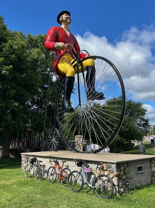 We enjoyed the long downhill until almost Sparta. A quick stop at the Speed Bike Shop, which is sadly for sale, and then pedaling onto the La Crosse River Trail. Ready for an early morning snack, we jumped off the trail and headed into downtown Sparta. Many tourists were shopping, eating, and browsing the farmer’s market. On the way back to the trail, we stopped at the park, where the famous giant statue of a man on a penny-farthing was standing.