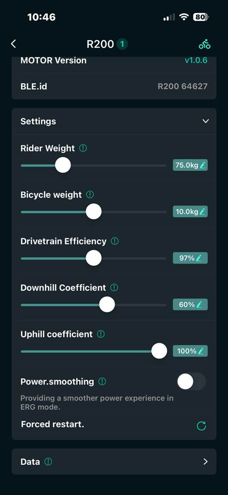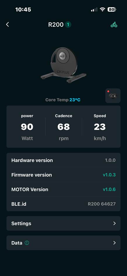 Next, download the CYCPLUS app, select the trainer, and adjust for the rider’s and the bike’s weights. The trainer auto-calibrates the power numbers for you, eliminating calibration spin-downs.